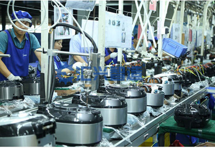 匯興智造電飯煲整廠自動化生產(chǎn)線是由各式差速鏈裝配檢測線、懸掛輸送裝配線、輥道輸送裝配線、鏈板式電機浸漆線、電飯煲測試檢測線組成,另外包括自動噴涂設備、頂升平移機、打包機等各類專機設備,共同完成電飯煲的生產(chǎn)任務。