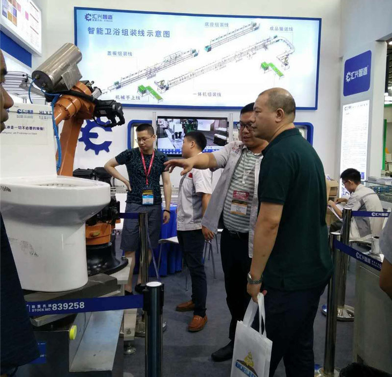 匯興智造展出的陶瓷衛浴打磨機器人綻放異彩,從加工、組裝、噴涂、打磨、焊接、輸送等各種制造環節的機器人,到智能化、定制化的衛浴生產線的應用,深深地吸引參展觀眾的圍觀。
