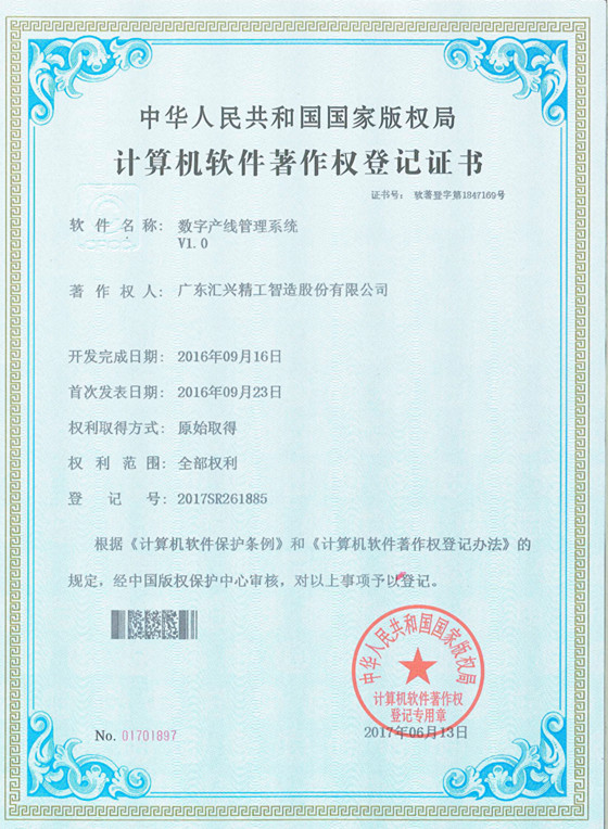 近日,匯興智造喜報(bào)頻傳,繼之前獲得多項(xiàng)發(fā)明專利和商標(biāo)注冊之后,又參與國家標(biāo)準(zhǔn)的起草,如今再次獲得五項(xiàng)國家版權(quán)局計(jì)算機(jī)軟件著作權(quán)登記證書,它們分別是產(chǎn)品數(shù)字化追溯系統(tǒng)、車間生產(chǎn)工藝參數(shù)監(jiān)控系統(tǒng)、車間生產(chǎn)設(shè)備維護(hù)管理系統(tǒng)、生產(chǎn)績效考核管理系統(tǒng)和數(shù)字產(chǎn)線管理系統(tǒng)這五大軟件。匯興智造17年來,精工制造各類智能自動(dòng)化生產(chǎn)線,擁有行業(yè)深厚的經(jīng)驗(yàn),在充分了解客戶的實(shí)際需求后,開發(fā)了產(chǎn)品數(shù)字化追溯系統(tǒng)等軟件,并取得相關(guān)著作權(quán)。其中,權(quán)利取得方式為原始取得,權(quán)利范圍為全部權(quán)利。