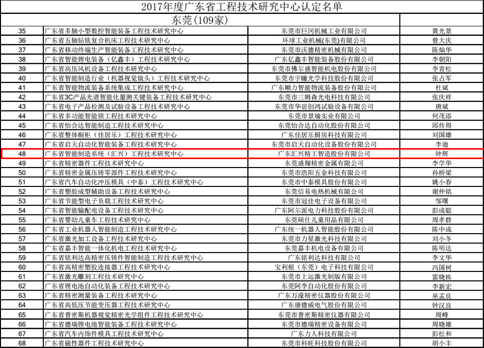 2017年9月25日,匯興智造設立的 “廣東省智能制造系統(匯興)工程技術研究中心”被廣東省科技廳認定為“2017年度廣東省工程技術研究中心”。省級工程技術研究中心的建設是為了深入貫徹落實廣東省科技創新大會精神,推進規模以上企業建立研發機構,增強高校和科研院所的技術創新能力,加快科技成果轉化,為建設國家科技產業創新中心提供支撐。