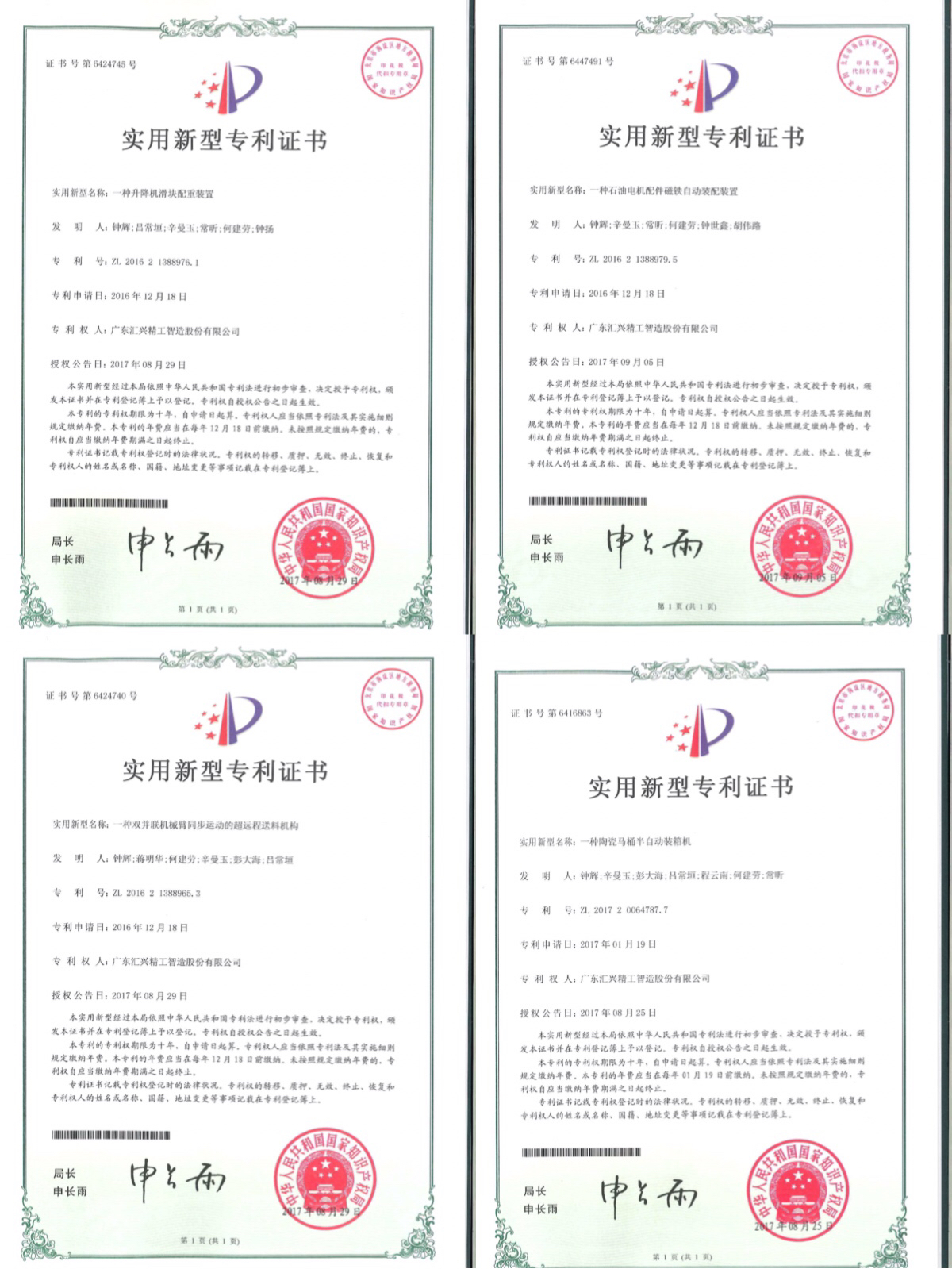 2017年9月25日,廣東匯興精工智造股份有限公司(股票代碼:839258)又獲得四項實用新型專利授權。關于一種升降滑塊配重裝置、一種石油電機配件磁鐵自動裝備裝置、一種雙并聯機械臂同步運動的遠超程送料機構、 一種陶瓷馬桶半自動裝箱機專利申請,經中華人民共和國國家知識產權局專利審查局嚴格審查終于順利通過,獲得授權。迄今為止,公司授權專利數達39項,且研究試驗用資金投入今年花費比去年進一步增加。
