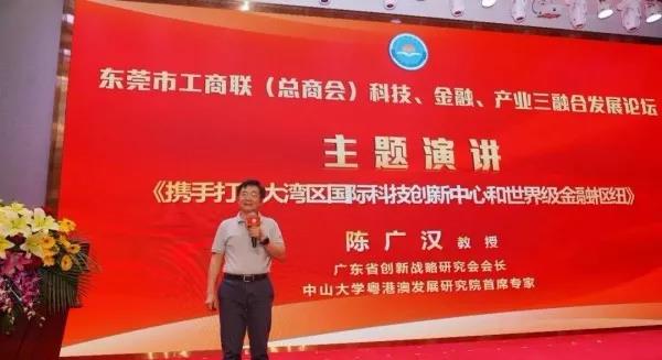 大會還邀請廣東省創新戰略研究會會長、中山大學粵港澳發展研究院首席專家陳廣漢教授作了《攜手打造大灣區國際科技創新中心和世界級金融樞紐》主題演講。陳廣漢教授就東莞在參與粵港澳大灣區建設的過程中,在推動科技、金融、產業“三融合”方面的機遇與主要努力方向進行全方位解讀。