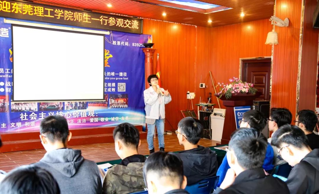 隨后,蔣明華在公司大會議室向師生們詳細介紹了公司的發展歷程、產品特點、核心優勢、企業文化、人力資源、員工晉升通道等方面的概況,并熱忱歡迎東莞理工學院學子來公司參觀,更歡迎畢業的大學生來公司就業。