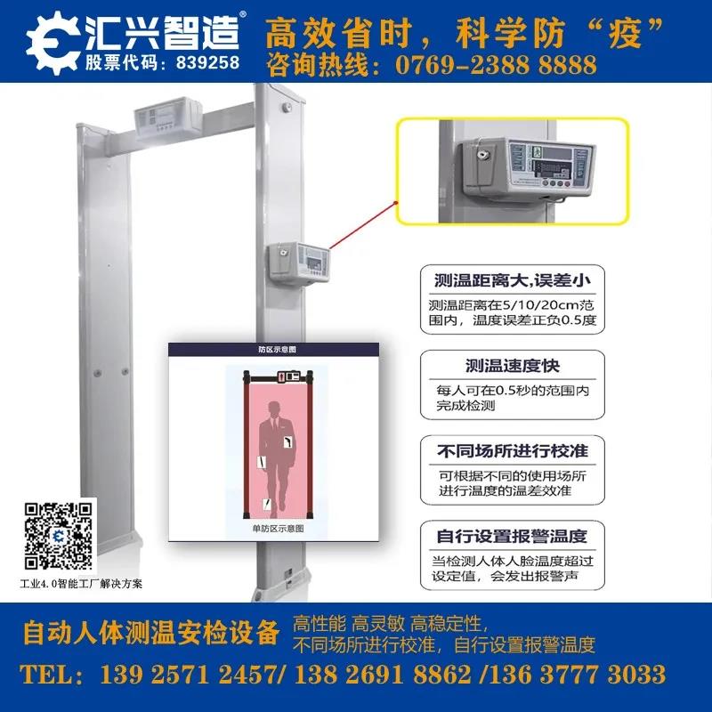匯興智造人體測溫安檢門將集紅外測溫和金屬檢測為一體化,可對通過安檢門的人員進(jìn)行溫度測試,如若超過安全溫度閾值將聯(lián)動安檢門聲光報(bào)警,有效對人員進(jìn)行篩查并建立首道防線。