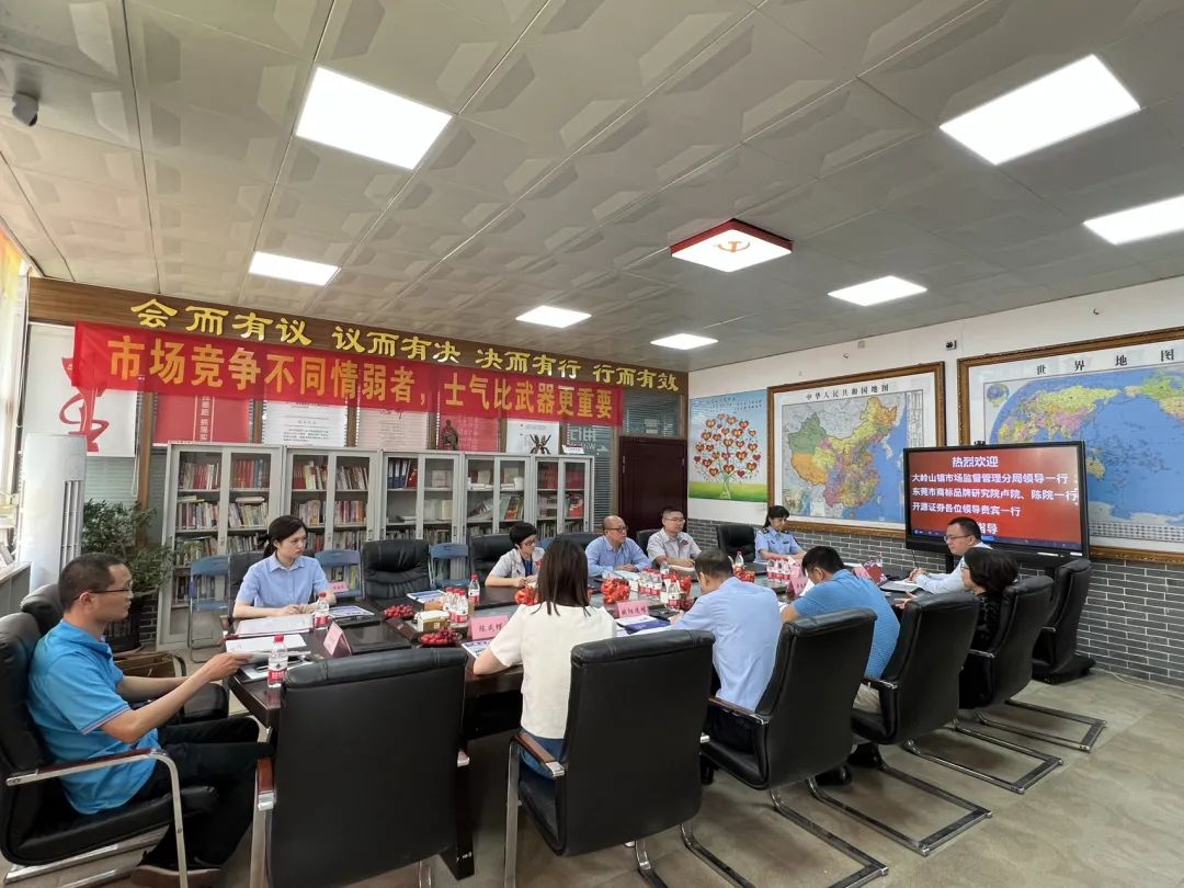 5月15日,大嶺山市場監管局調研員高級主辦劉明周、監管二股股長歐陽送明一行,東莞市商標品牌研究院榮譽院長盧靜娜、副院長陳成蝶、智庫專家周沛