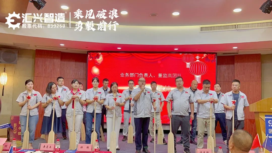 參會現場董監高上臺在沒有任何彩排的情況下,進行劃龍舟展示,在鐘董的指揮下,整齊劃一的劃動船槳。意在把團結拼搏、奮勇向前的龍舟精神轉化為推動匯興智造高質量發展的動力,激勵大家在干事創業的賽道上,拼出精彩,拼出未來。